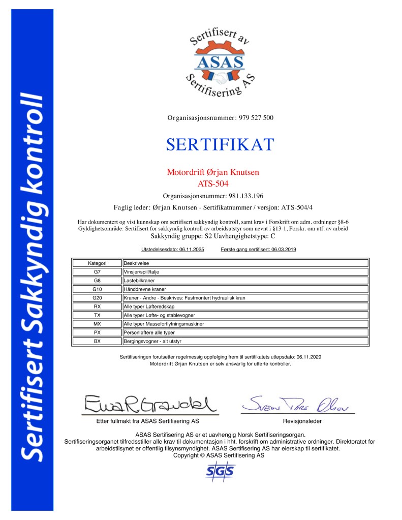 Motordrift har siden 2007 vært sertifisert som sakkyndig virksomhet for å utføre lovpålagt årlig kontroll av arbeidsutstyr, herunder: